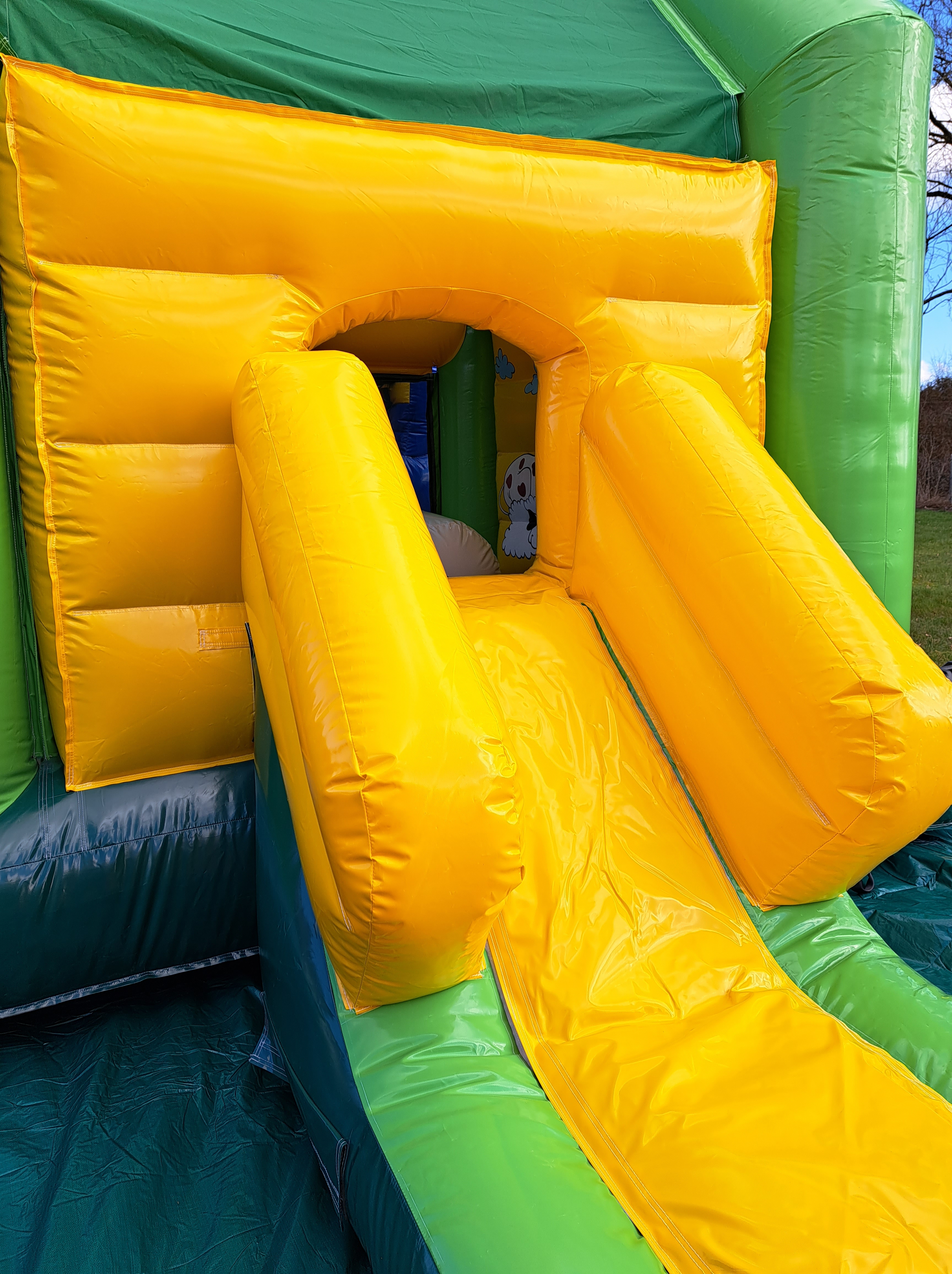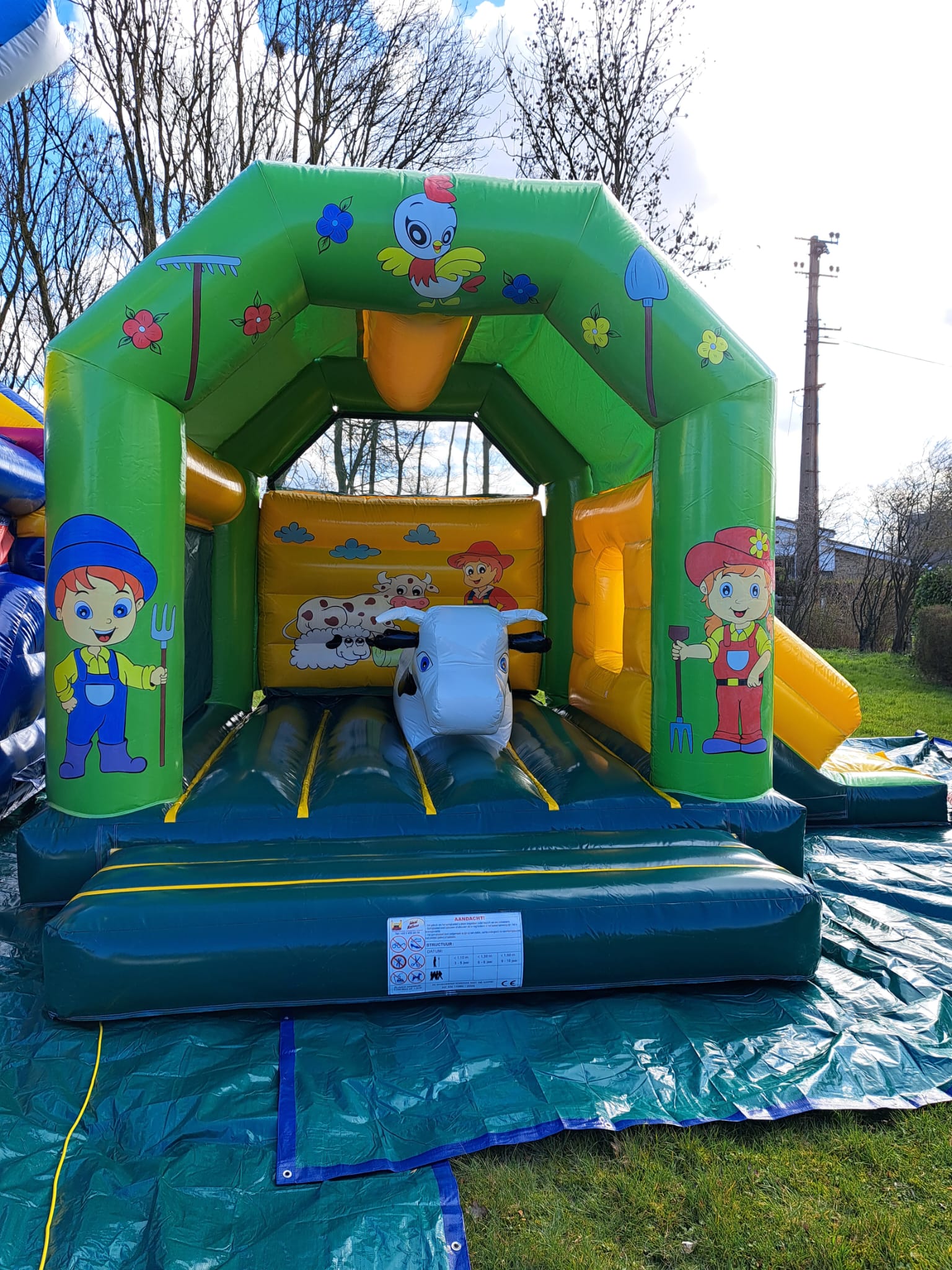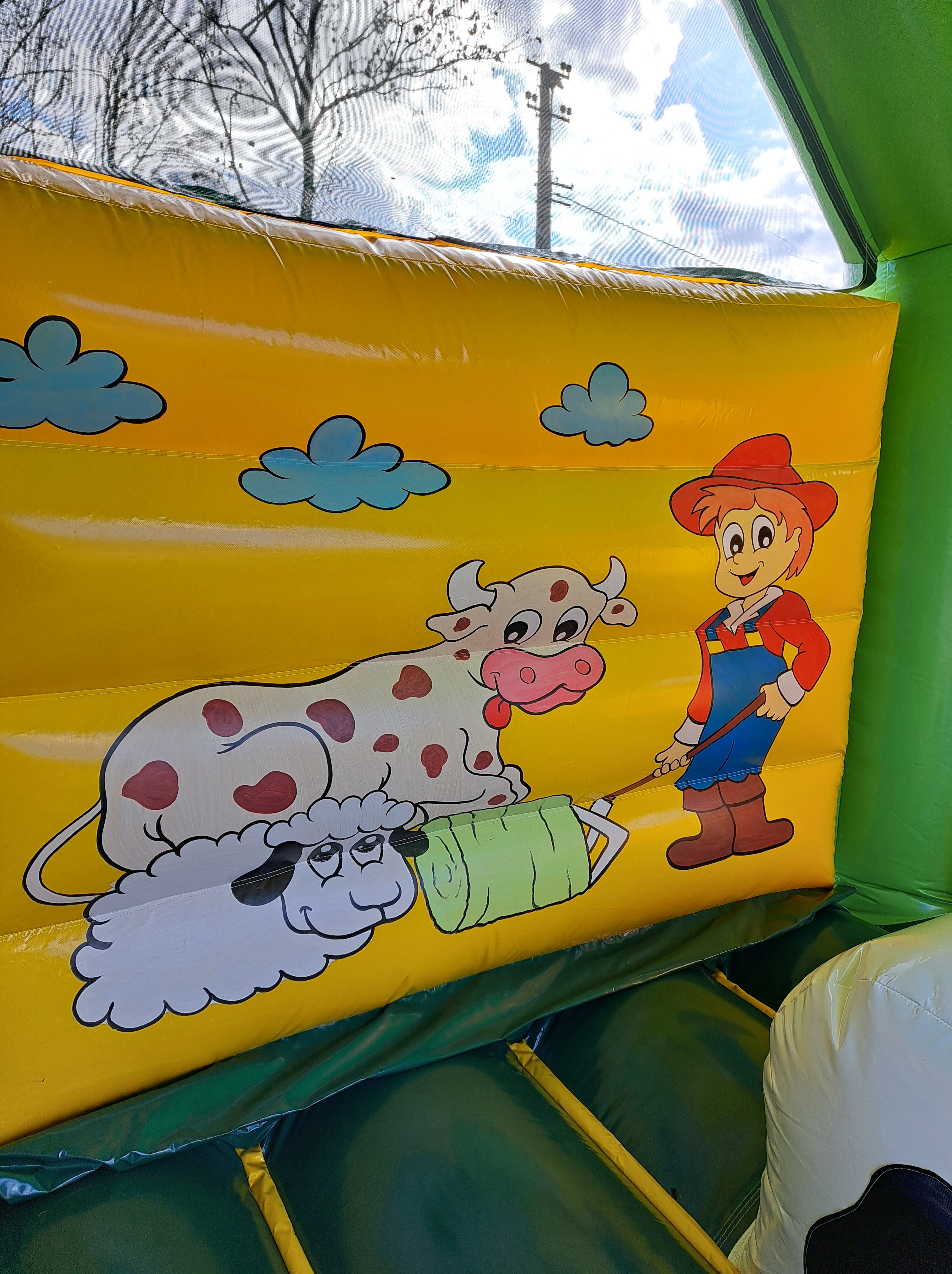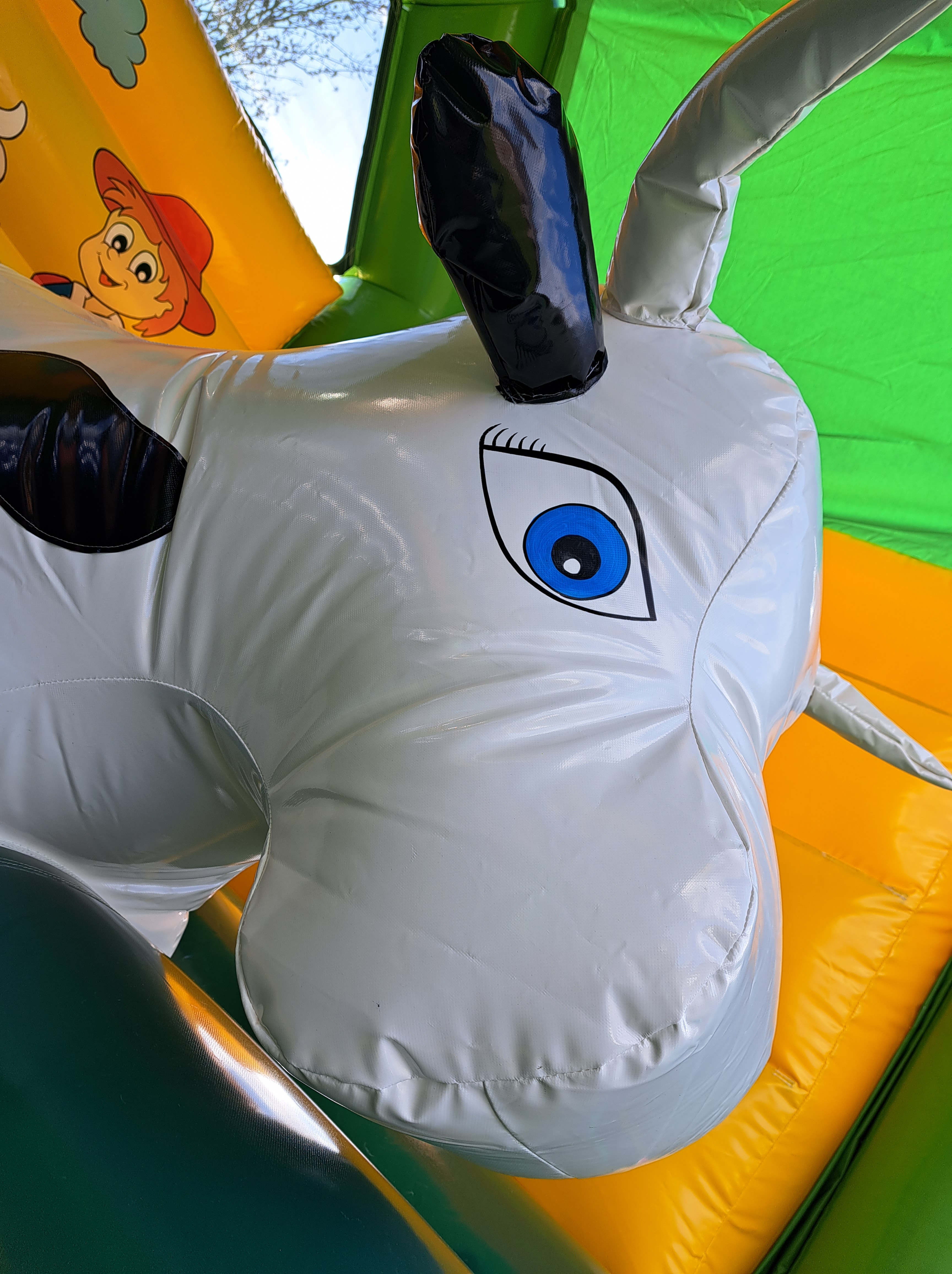 Ce grand château ravira vos enfants par sa surface de sauts, sa grosse vache en plein milieu et son toboggan extérieur. Il peut accueillir 10-12 enfants et est couvert pour protéger vos enfants des rayons du soleil.